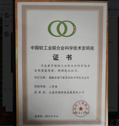 实德聚酯合金门窗系统技术荣获中国轻工业联合会科学技术发明奖二等奖